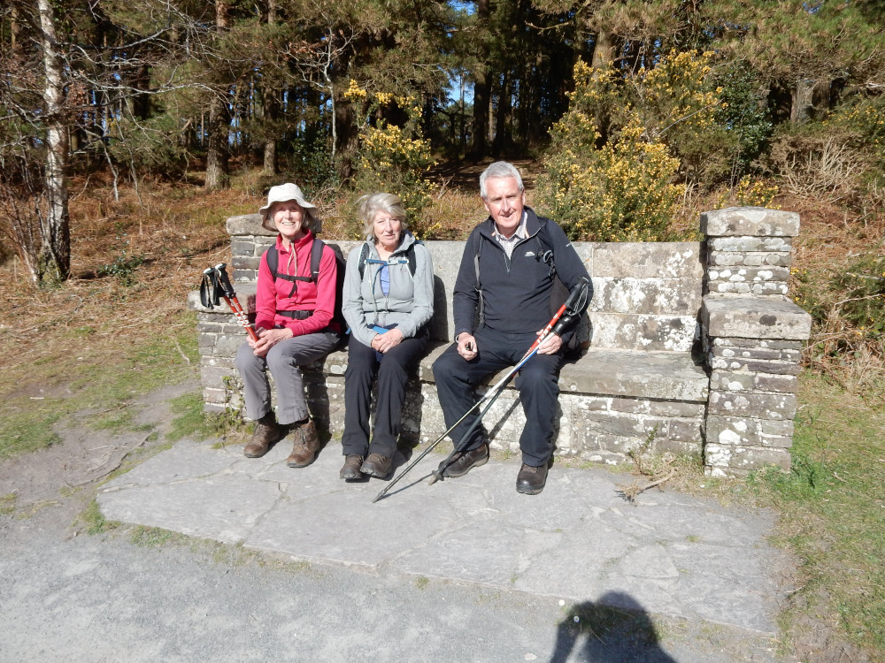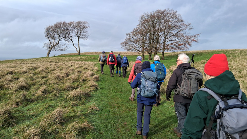 Leaving the viewpoint, we took a short detour from the main path to fix a memorial plaque to our founding member, who sadly passed away earlier in the year. After a short pause to reflect on his gift to us individually and, collectively to the club he helped to form in 1977, we continued back to the main path and continued heading north. We stopped again just before 11, in the shelter of the trees on the edge of the ancient hill fort, for a second act of remembrance.