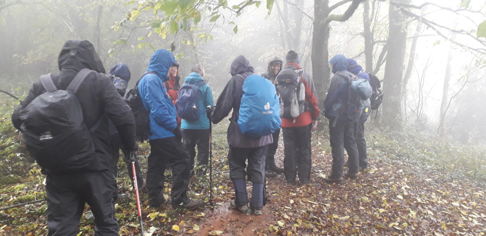 A wet day. 12 hardy souls met up at the Lower Wyndcliff Car Park on the A466 (between St Arvans & Tintern) on Remembrance Sunday. We climbed up through the woods (following the moderate route) to reach The Eagles Nest viewpoint which normally offers spectacular views over the river and across into parts of Gloucestershire and Somerset - sadly the view was reduced by the foggy conditions.