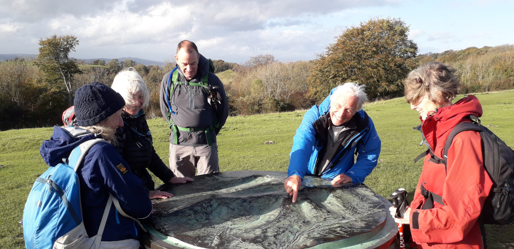 Leaving the viewpoint, we took a short detour from the main path to fix a memorial plaque to our founding member, who sadly passed away earlier in the year. After a short pause to reflect on his gift to us individually and, collectively to the club he helped to form in 1977, we continued back to the main path and continued heading north. We stopped again just before 11, in the shelter of the trees on the edge of the ancient hill fort, for a second act of remembrance.
